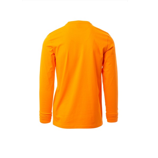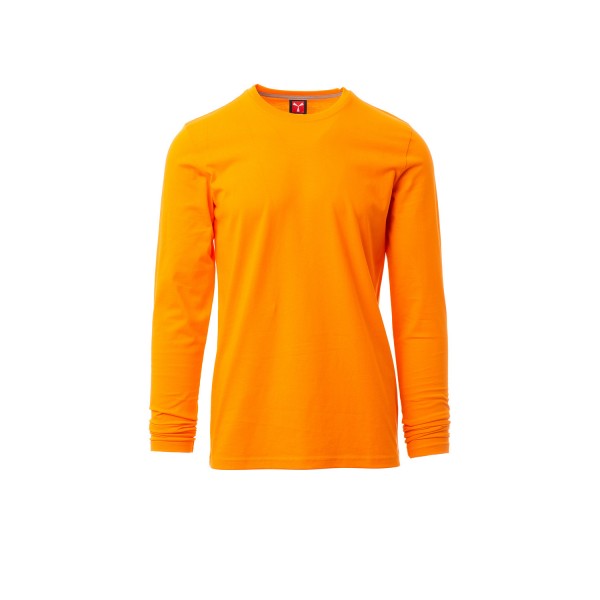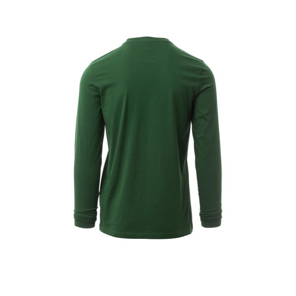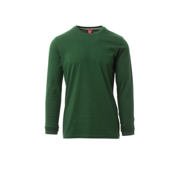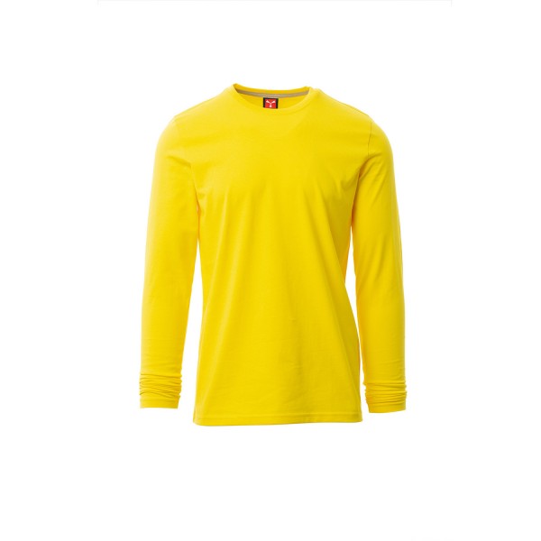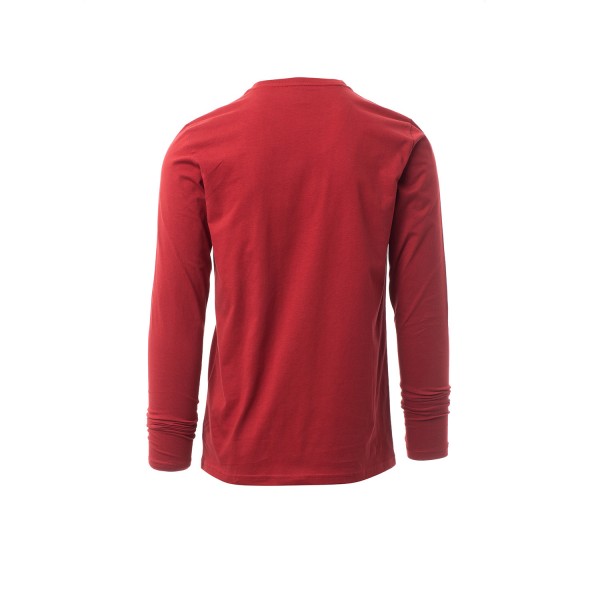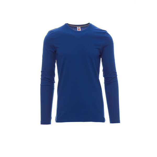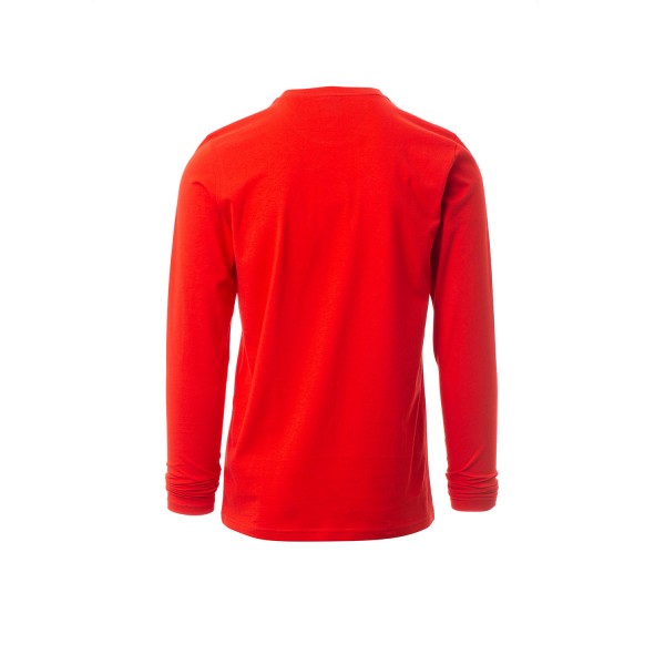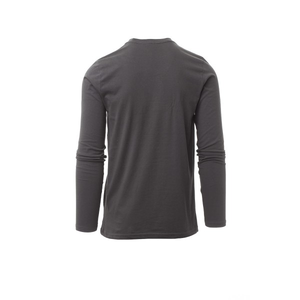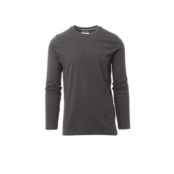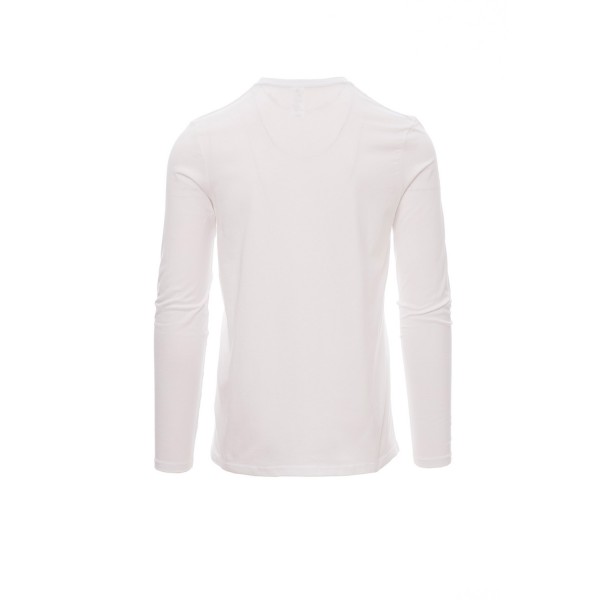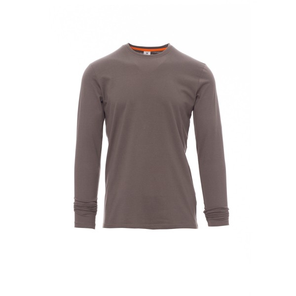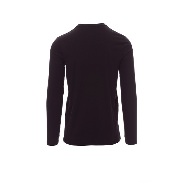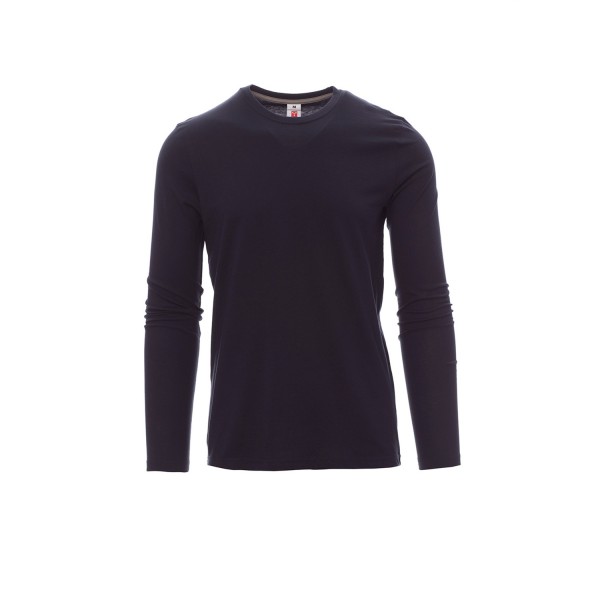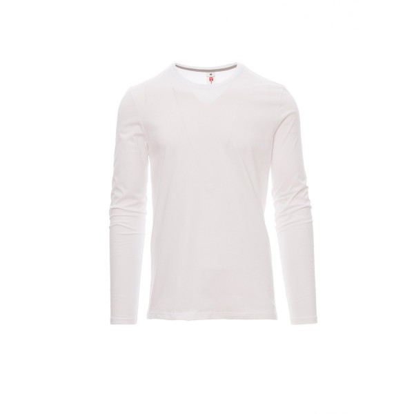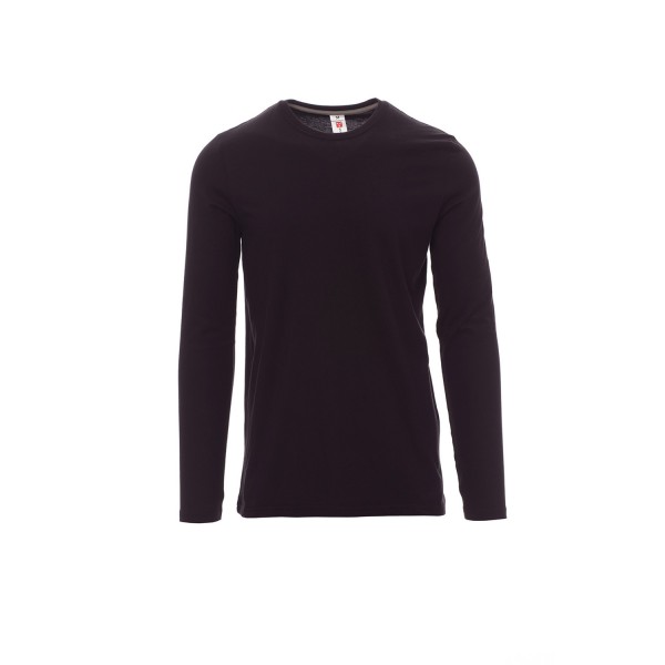 100% coton. 165g/m² encolure ras le cou et manches longues, col en bord côtes mixte spandex de 1,5 cm avec couture rabattue sur le devant, ruban de renfort d'épaule à épaule dans couleur en contraste sur le col, coutures stretch, couture latérale