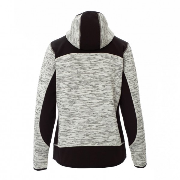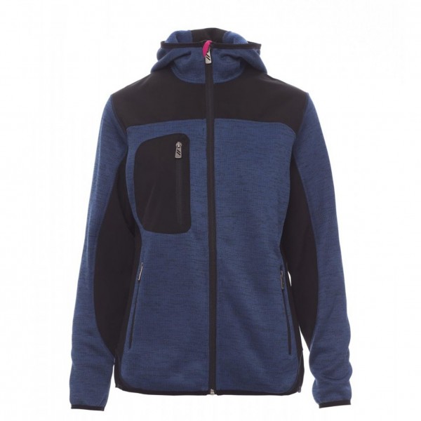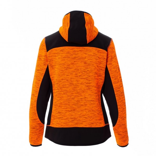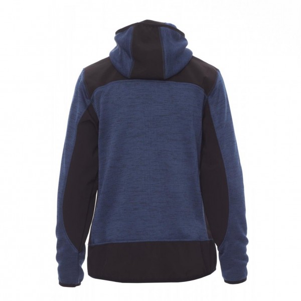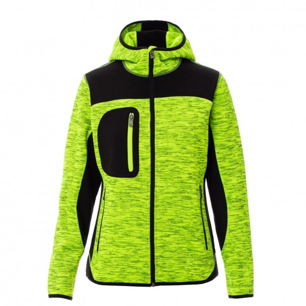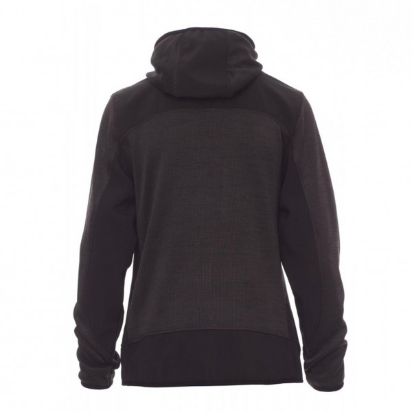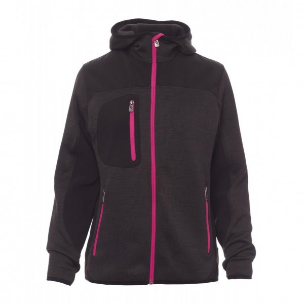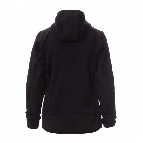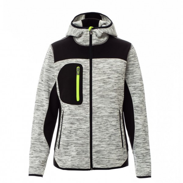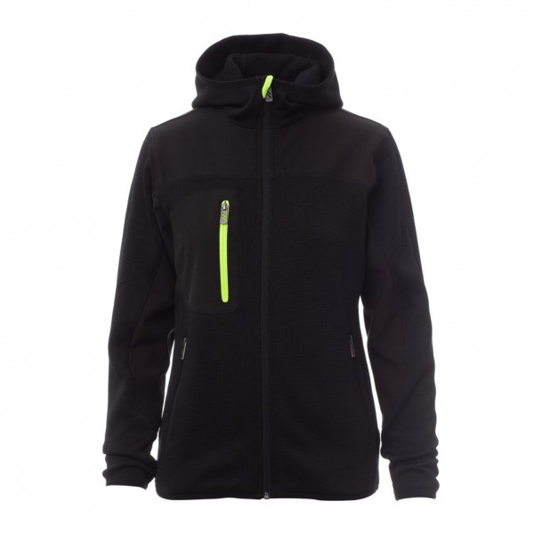 100% polyester. Tricot technique avec inserts en soft-shell noirs, bicolore, zip long SBS avec ruban, capuche profilée avec deux coutures, fi n liseré aux poignets et à la taille, deux poches latérales avec zip, une poche poitrine.